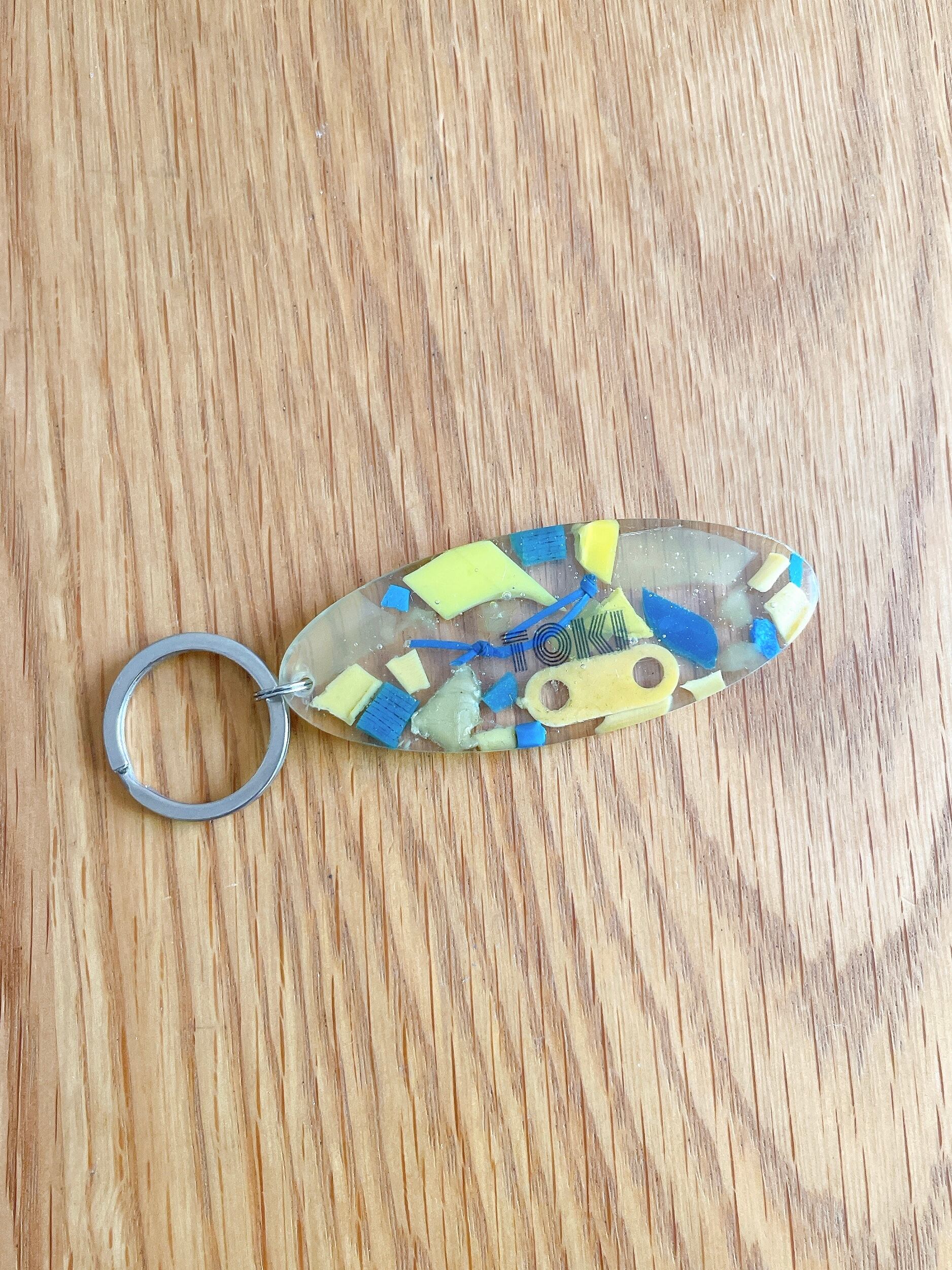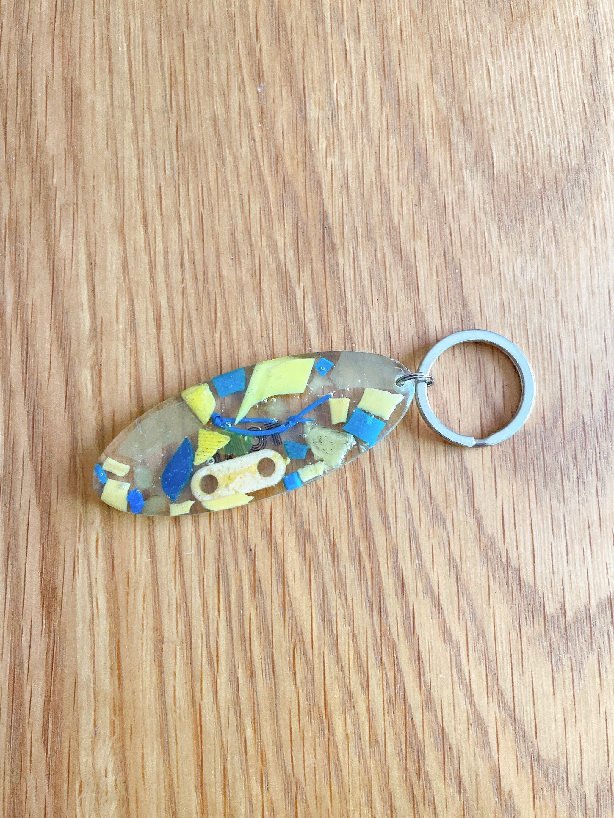 海で拾った海洋プラごみをキーホルダーにアップサイクルしました。