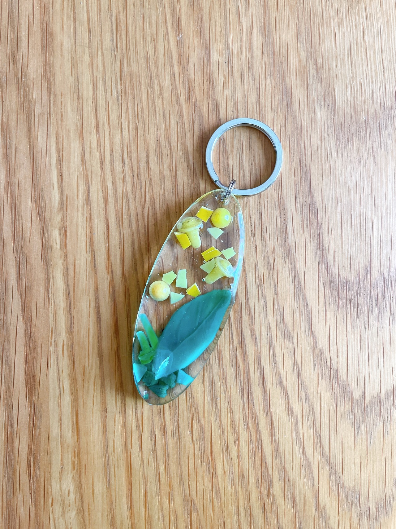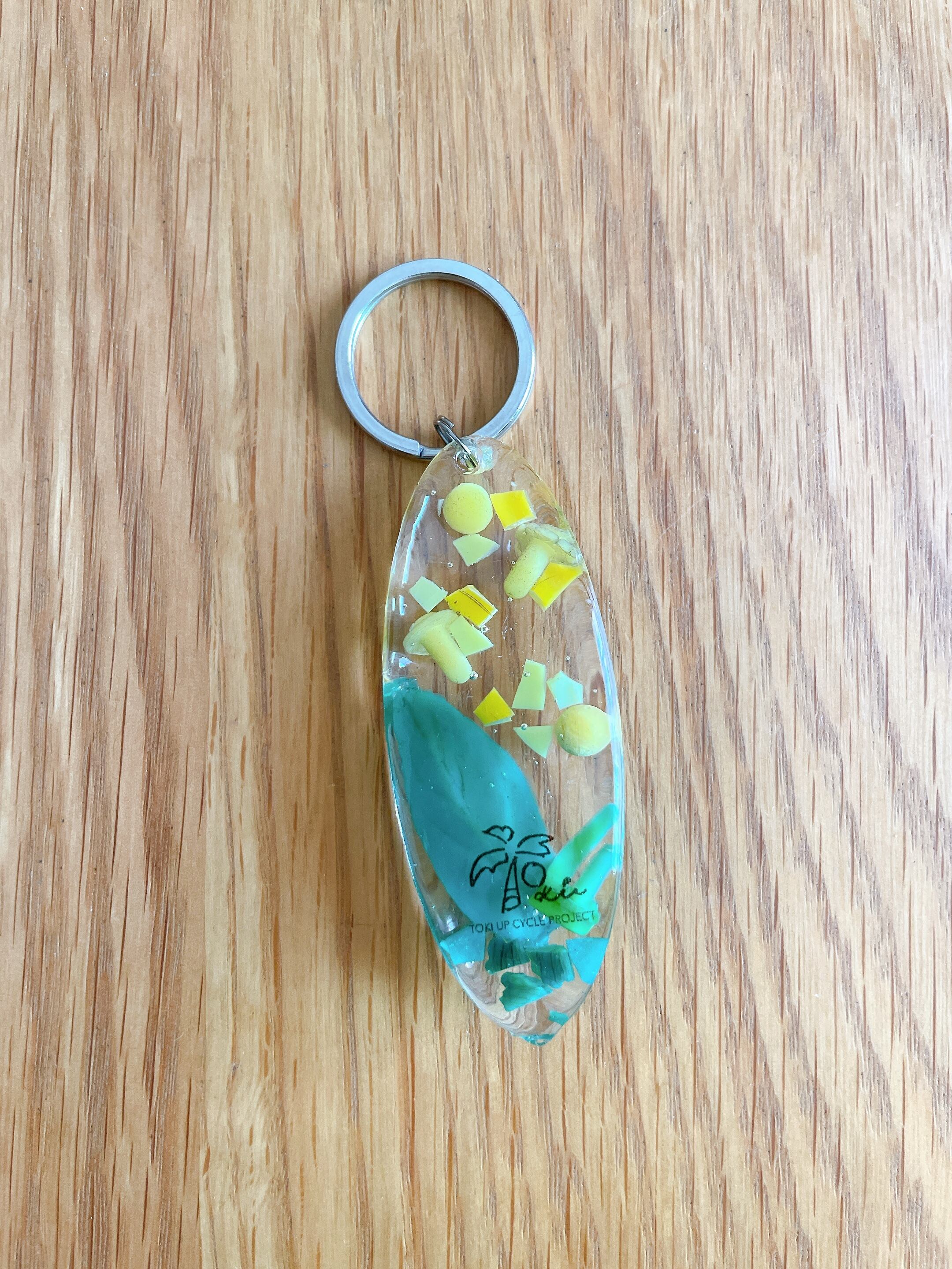 海で拾った海洋プラごみをキーホルダーにアップサイクルしました。