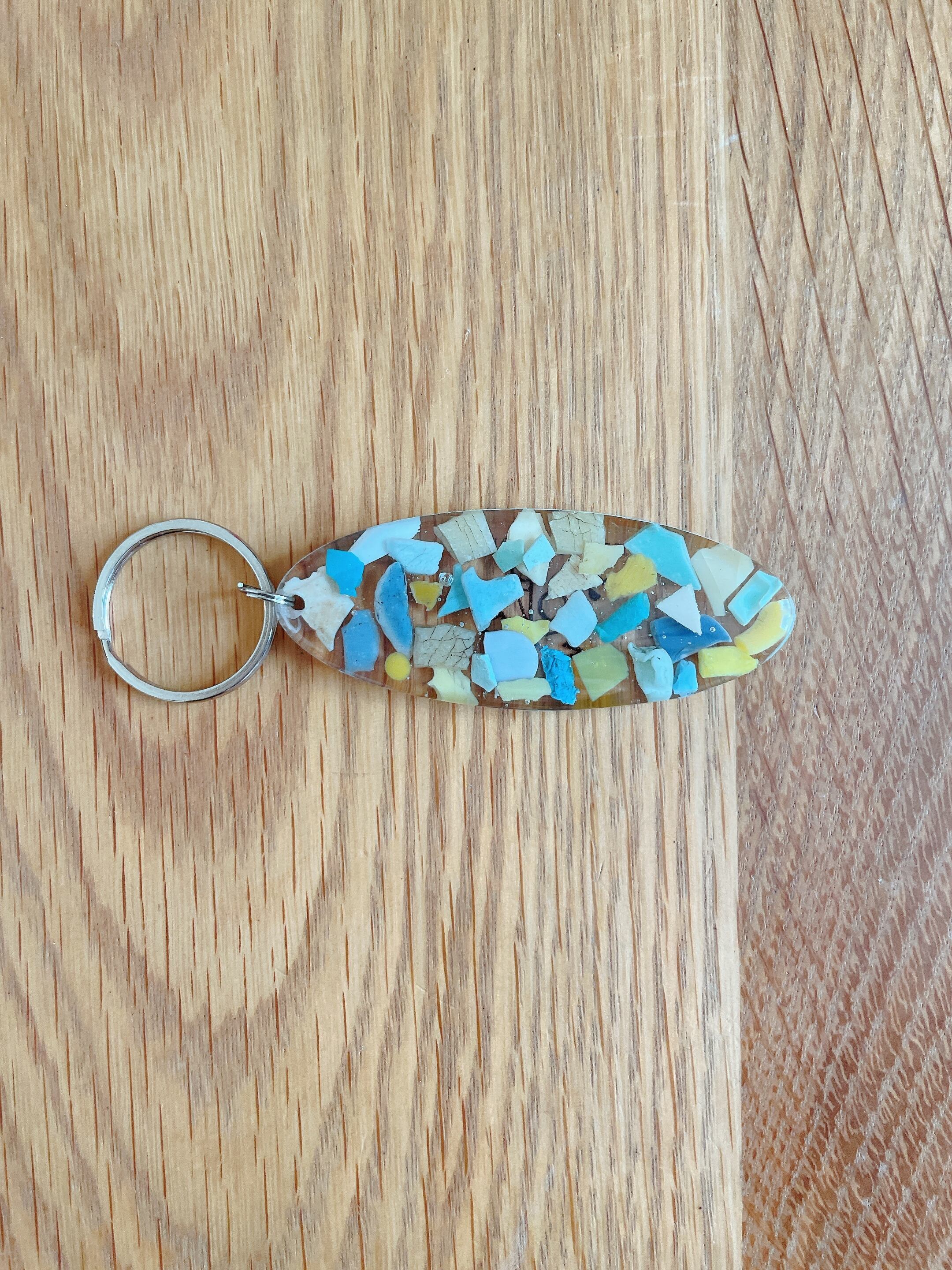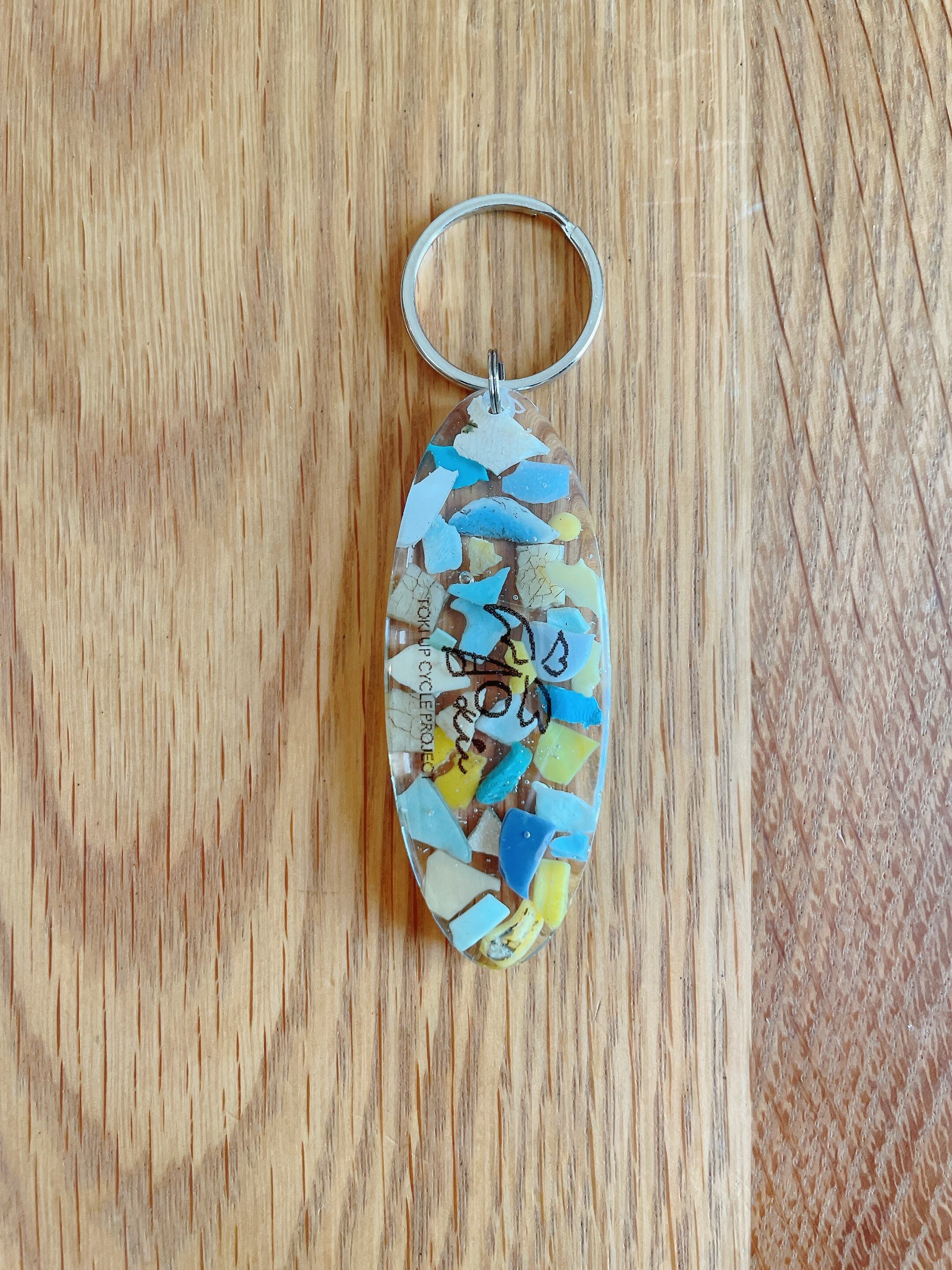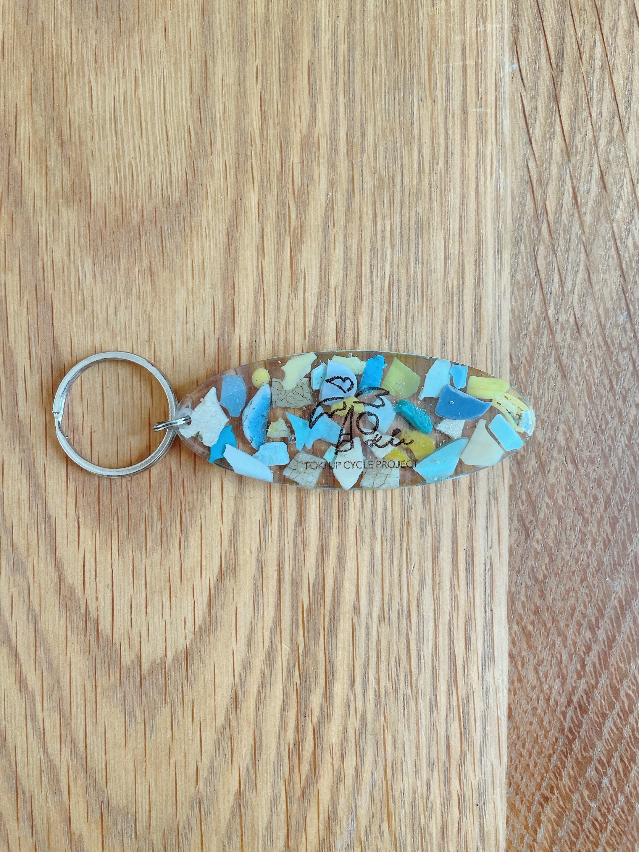 海で拾った海洋プラごみをキーホルダーにアップサイクルしました。
